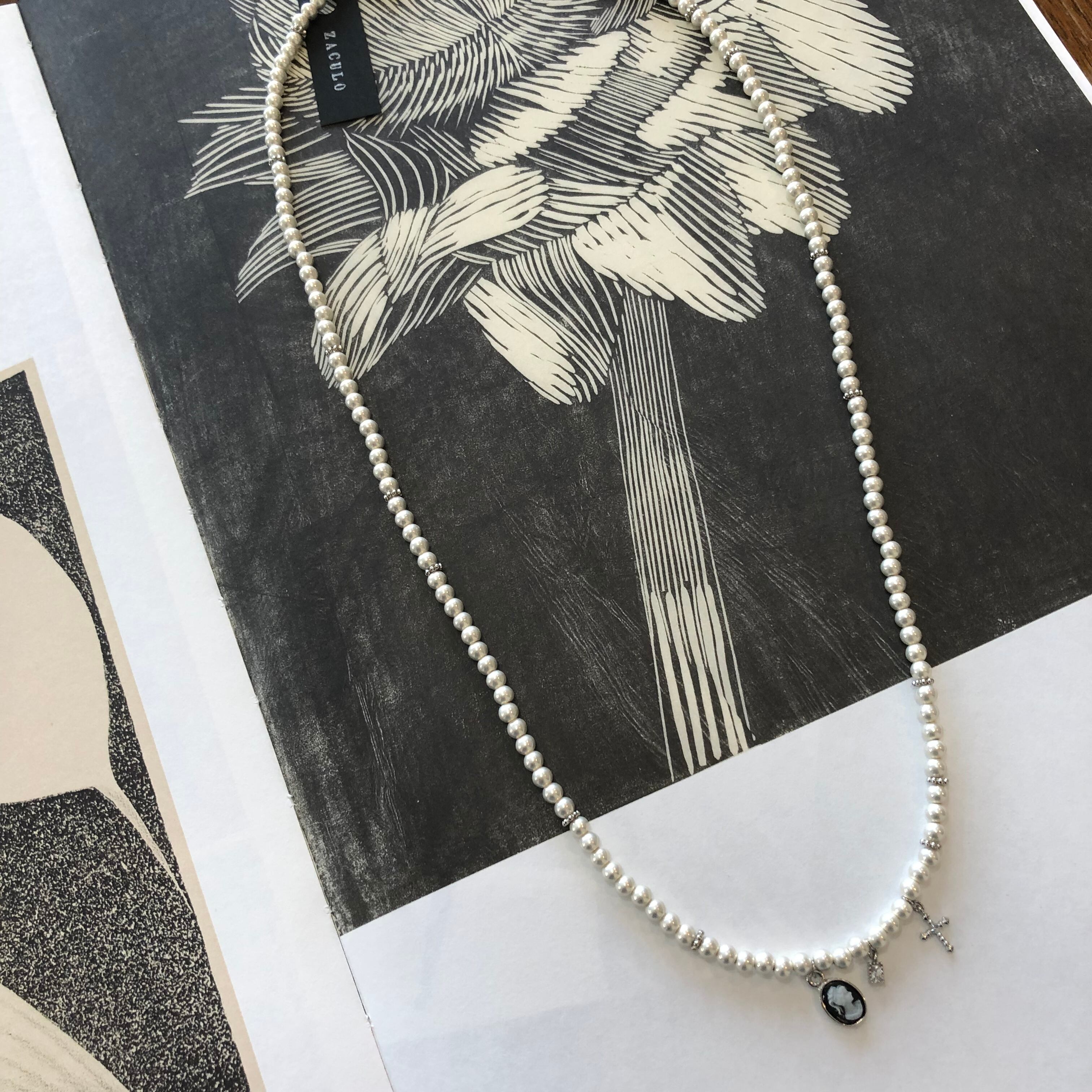カメオ、ジルコニア、クロスが並ぶロングネックレス。パールではなく、メタルボールを使う事で甘くなりすぎずクールな印象に。