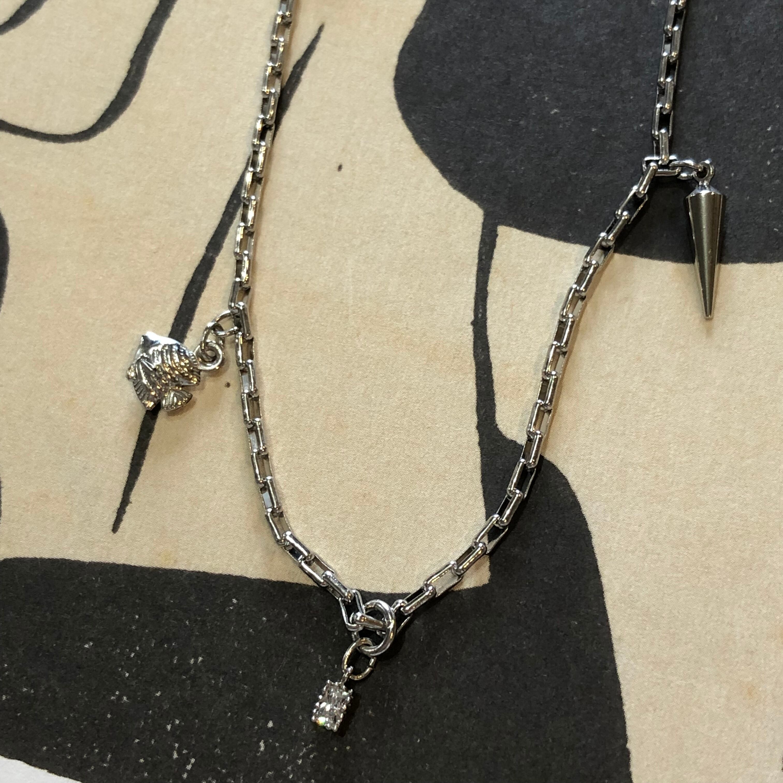 スタッズ、ジルコニア、フィッシュの3種類のチャームで遊びのあるカジュアルなネックレス。